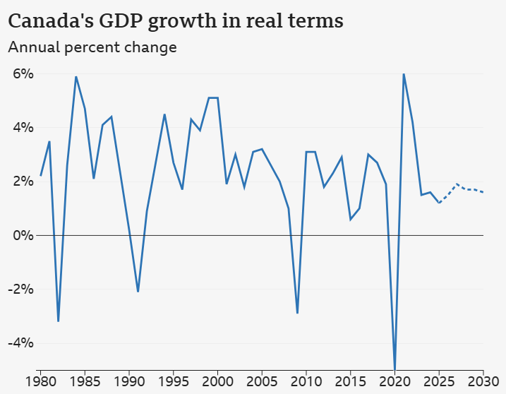 The Bank of Canada projects the country’s GDP will grow by 1.2% in 2025, 1.1% in 2026 and 1.6% in 2027.