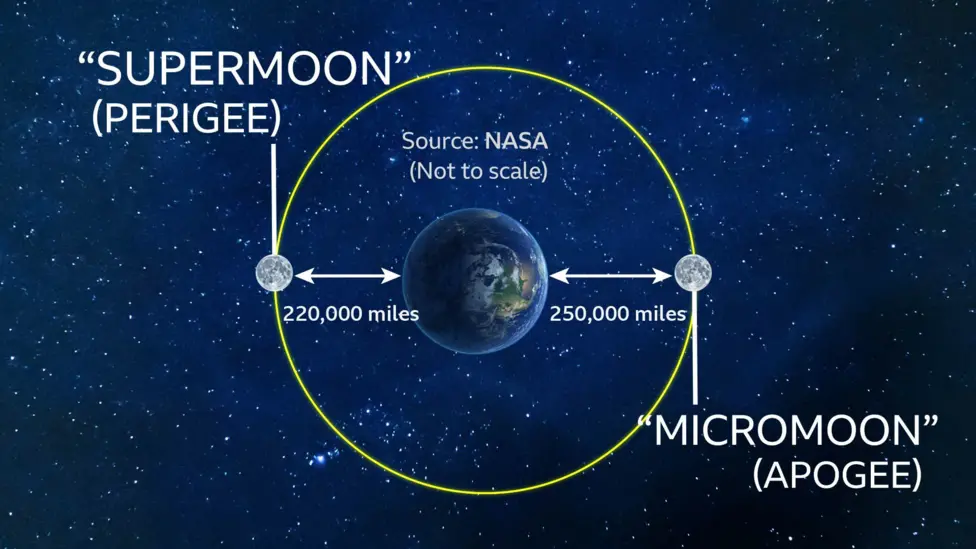 At its closest point – or perigee – the Moon is about 220,000 miles away from Earth, whereas at its furthest point – or apogee – it is around 250,000 miles away.